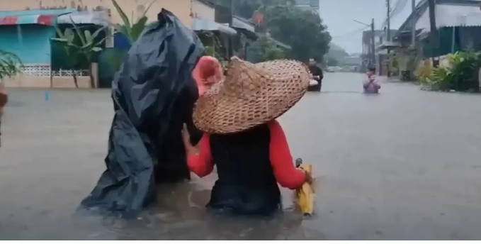 Desa Sateng Nok Moo 9 di distrik Mueang terendam banjir, sehingga memaksa penduduk mengungsi ke zona aman.