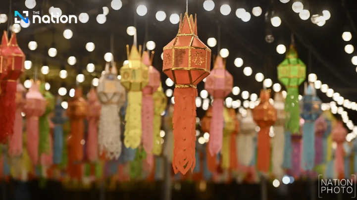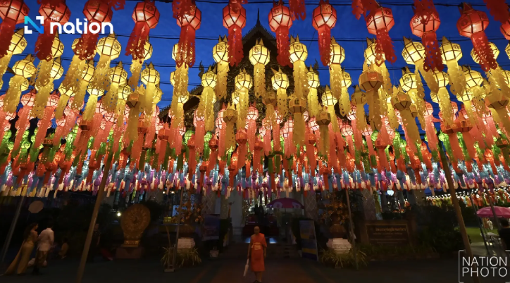 Lamphun, Suarathailand- Ribuan wisatawan dan penduduk setempat berbondong-bondong ke distrik Wat Phra That Hariphunchai di Lamphun untuk menyalakan lentera untuk menghormati relik Buddha sebagai bagian dari "Festival 100.000 Lentera" tahunan.