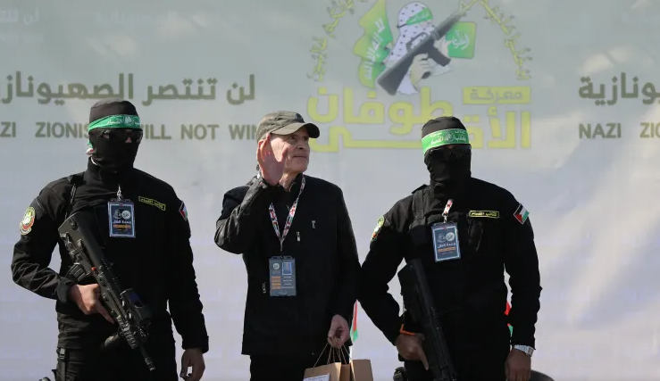 Ratusan pejuang Hamas terlihat berbaris dan mengatur kerumunan di Khan Younis dan Kota Gaza, saat Kalderon, Bibas, dan Siegel melambaikan tangan kepada kerumunan warga Palestina saat penyerahan.