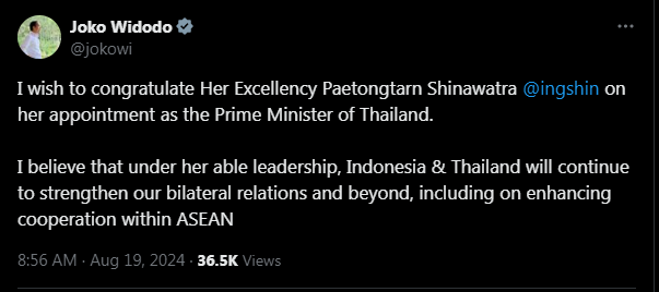 Jokowi percaya di bawah kepemimpinan PM Paetongtarn Shinawatra hubungan bilateral Indonesia-Thailand akan terus menguat. Indonesia dan Thailand akan terus memperkuat hubungan bilateral kami, termasuk meningkatkan kerja sama di dalam ASEAN.
