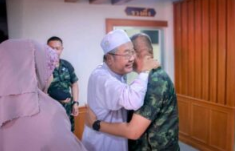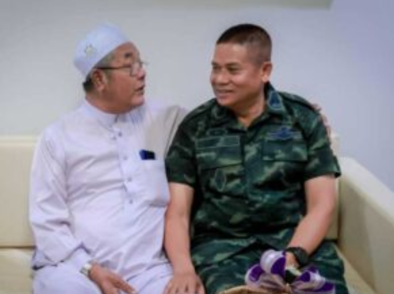 Letnan Jenderal Paisarn Nusang, Panglima Angkatan Darat ke-4/Direktur Komando Operasi Keamanan Dalam Negeri Wilayah 4 menyambut kunjungan Safi'i Jehlo, Ketua Komite Islam Provinsi Narathiwat, di Distrik Yarang, Provinsi Pattani.