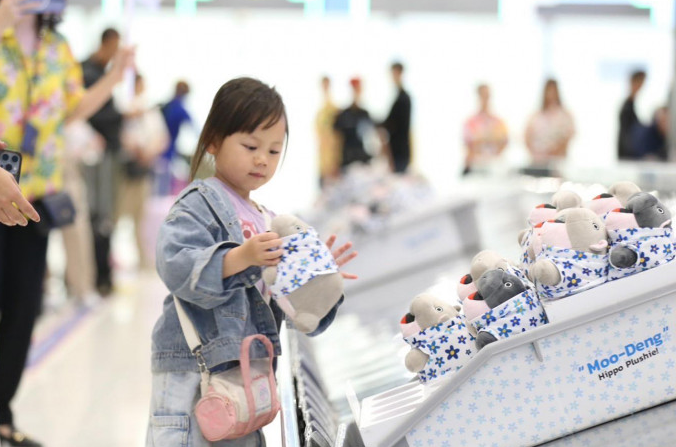 Bangkok, Suarathailand- Beberapa penumpang atau wisatawan yang mengunjungi Thailand untuk menikmati festival tahun baru Thailand disambut boneka Moo Deng hewan ikonik yang memikat orang di seluruh dunia untuk melihatnya.