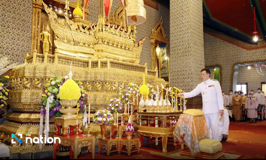 Ritual dimulai di Aula Ho Sulalai Phiman,, Yang Mulia menyalakan lilin dan menuangkan air suci pada patung Buddha