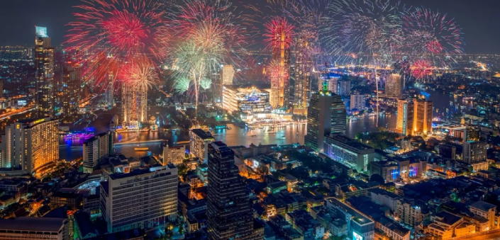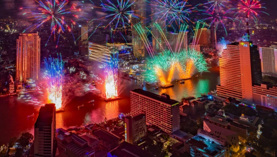 Sebagai sorotan dari “Amazing Thailand Countdown 2025”, tampilan kembang api ramah lingkungan membentang lebih dari 1.400 meter, terlihat dari hingga lima kilometer di sepanjang kedua tepi sungai.