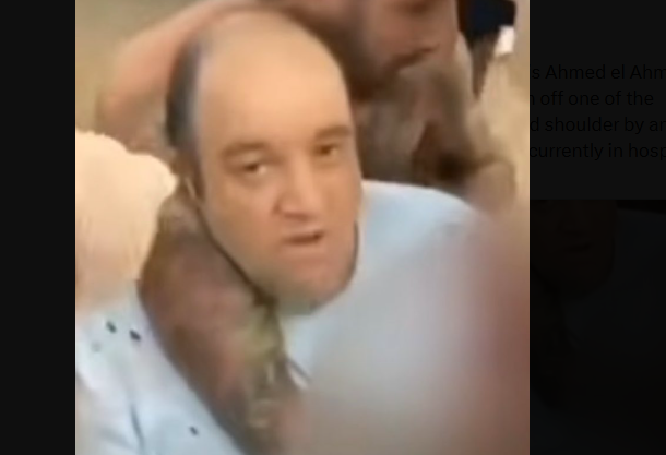 Rekaman tersebut menyebar dengan cepat secara online, menuai pujian luas atas keberanian al-Ahmed, dengan banyak yang mengatakan intervensinya kemungkinan mencegah pertumpahan darah lebih lanjut. (Foto kaos putih: Ahmed yang dipuji selamatkan banyak orang)