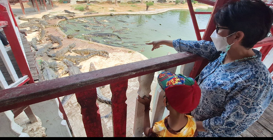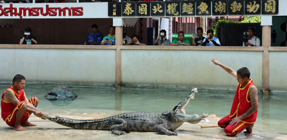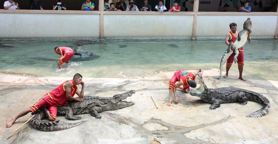 Atraksi membahayakan manusia versus buaya Kembali dibuka di Peternakan buaya terkenal di Samut Prakan Thailand pada 1 April. Sebelumnya atraksi ini ditutup sejak tahun 2020 karena penurunan drastis jumlah wisatawan selama Covid-19.