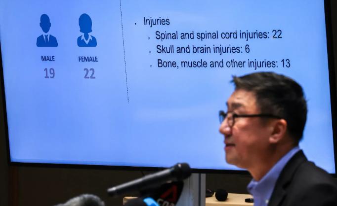Cedera dikategorikan sebagai berikut: 22 orang mengalami cedera tulang belakang dan punggung, 6 orang mengalami cedera tengkorak dan otak, dan 13 orang mengalami cedera tulang, otot, dan jenis lainnya. Berdasarkan tingkat keparahan cederanya, satu pasien yang sebelumnya dalam kondisi kritis telah menunjukkan kemajuan yang signifikan dan telah diizinkan oleh dokter untuk kembali ke rumah.