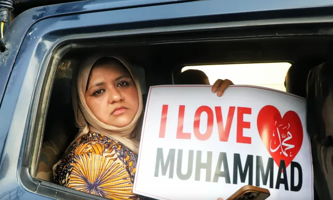 Papan nama itu bertuliskan: "Aku cinta Muhammad" – dengan hati merah yang melambangkan kata, cinta.