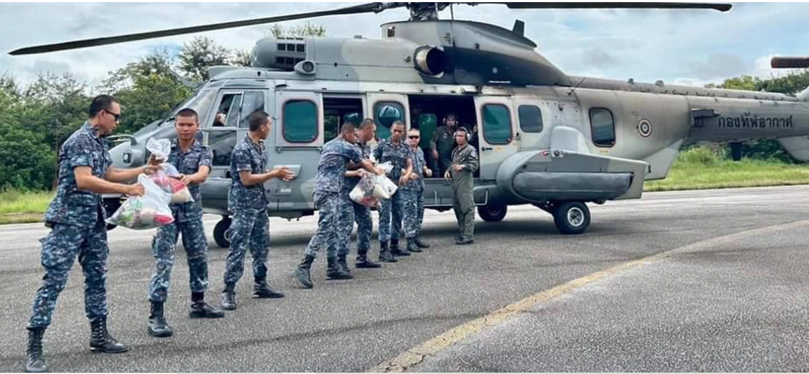 Chiang Rai, Suarathailand- Helikopter Angkatan Udara Kerajaan Thailand dikerahkan untuk memberikan bantuan darurat kepada penduduk distrik Mae Sai di Chiang Rai setelah meluapnya Sungai Sai, menggenangi pos pemeriksaan perbatasan Pasar Tachileik dan area pasar Sai Lom Joy.