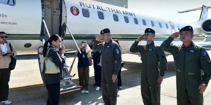 Setelah memimpin rapat Kabinet mingguan di Gedung Pemerintah, Paetongtarn dan suaminya, Pitaka Suksawat, menaiki pesawat militer di bandara militer Don Mueang pada siang hari.