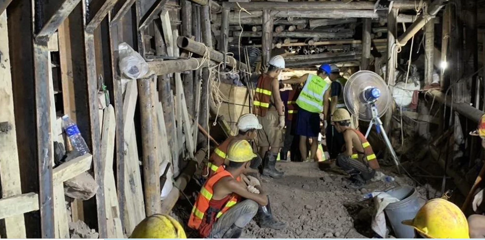 Setelah tanah longsor, yang terjadi pada pukul 23.40 pada hari Sabtu (24 Agustus), kontraktor Tiongkok mengatakan dua warga negara Tiongkok (seorang mandor dan pekerja) dan seorang pekerja Myanmar, terjebak di dalam terowongan.