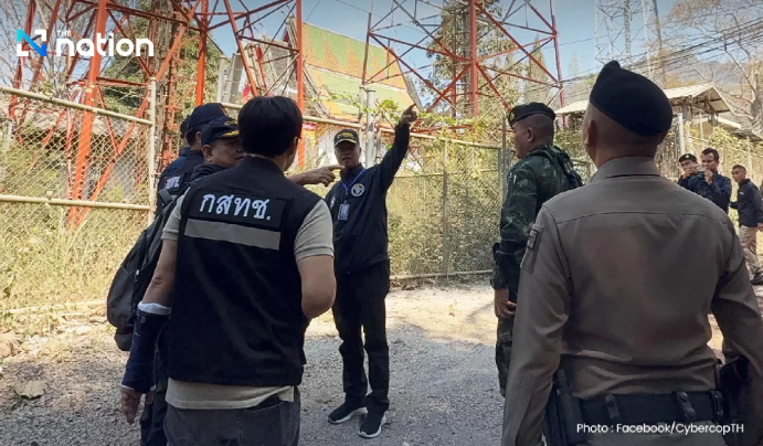 Polisi Investigasi Kejahatan Siber (CCIB) pada hari Jumat menyelidiki empat menara seluler di distrik Sangkhla Buri, provinsi Kanchanaburi yang diduga mengirimkan sinyal internet ke geng penipu pusat panggilan melintasi perbatasan Thailand-Myanmar.