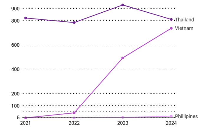 Sebaliknya, impor durian Tiongkok dari Vietnam - pemasok terbesar kedua - meningkat sebesar 14,6% tahun ke tahun bulan lalu dan 37,56% untuk seluruh tahun 2024, yang bernilai $2,9 miliar.