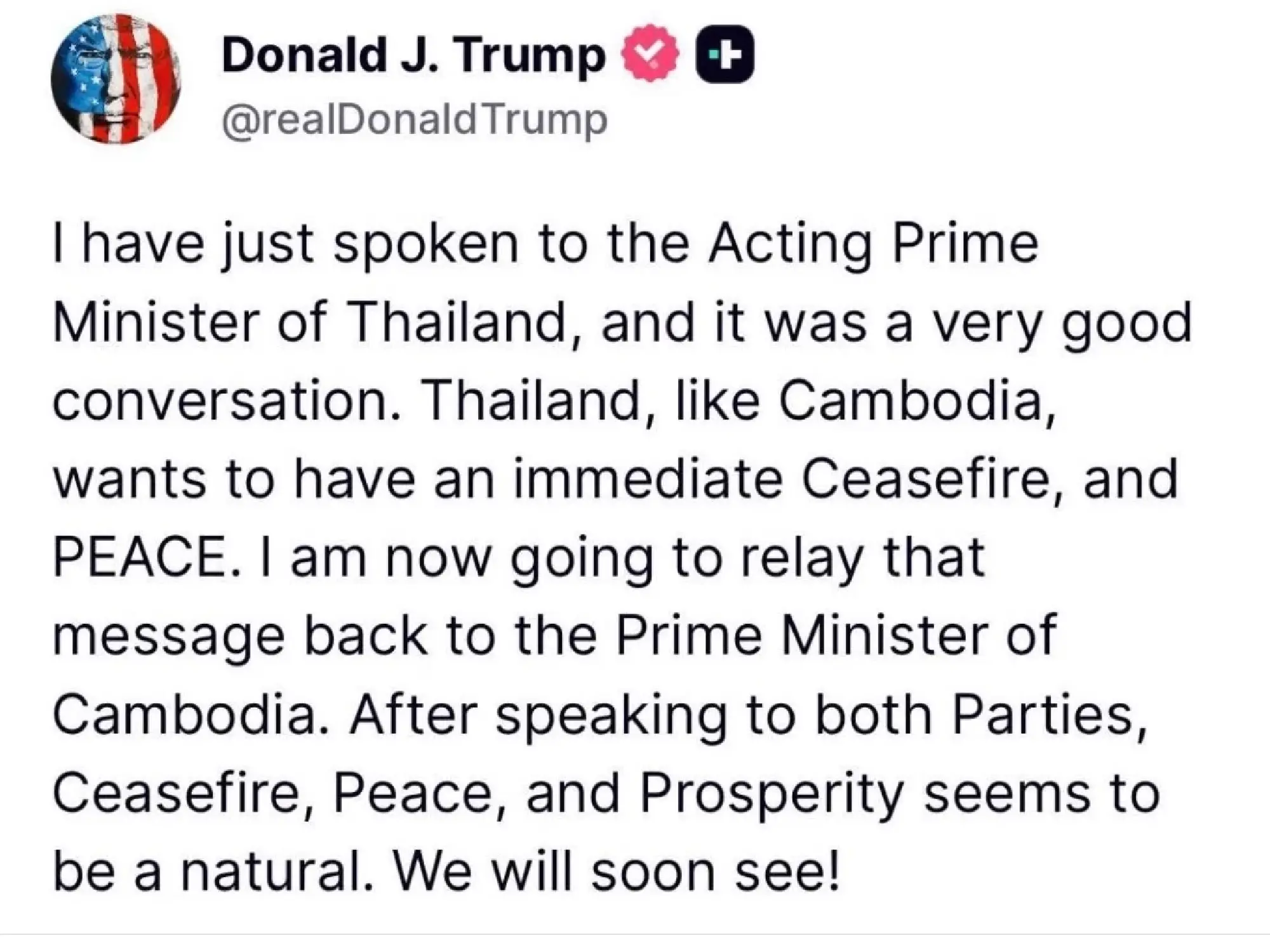 Trump menulis bahwa ia telah berbicara dengan Hun Manet mengenai penghentian permusuhan dengan Thailand dan sedang dalam proses menghubungi Phumtham untuk menyampaikan pesan yang sama. Ia meminta kedua belah pihak untuk meminta gencatan senjata dan mengakhiri perang yang ia gambarkan sebagai "sedang berkecamuk."