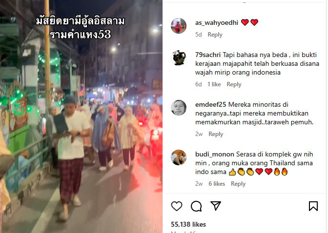Pemandangan muslim Pattani setelah salat tarawih menjadi viral setelah akun Instagram @unikinfold membagikan video ini. Banyak orang Indonesia berkomentar suasan setelah salat tarawih di Pattani mirip di Indonesia pada umumnya.
